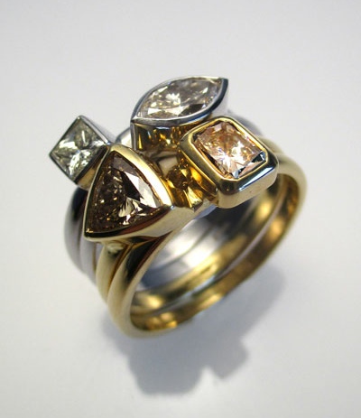 Set of 4 with natural coloured diamonds, 18ct white and yellow gold, 0.32ct pale yellow princess cut diamond, 0.58ct cinnamon trilliant cut diamond, 0.56 pale brown navette cut diamond, 0.44ct light brown radiant cut diamond.