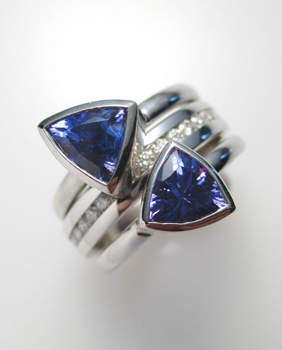 18ct white gold, 1.01ct trilliant tanzanite, 1.03ct trilliant tanzanite, 0.45ct diamond set band.